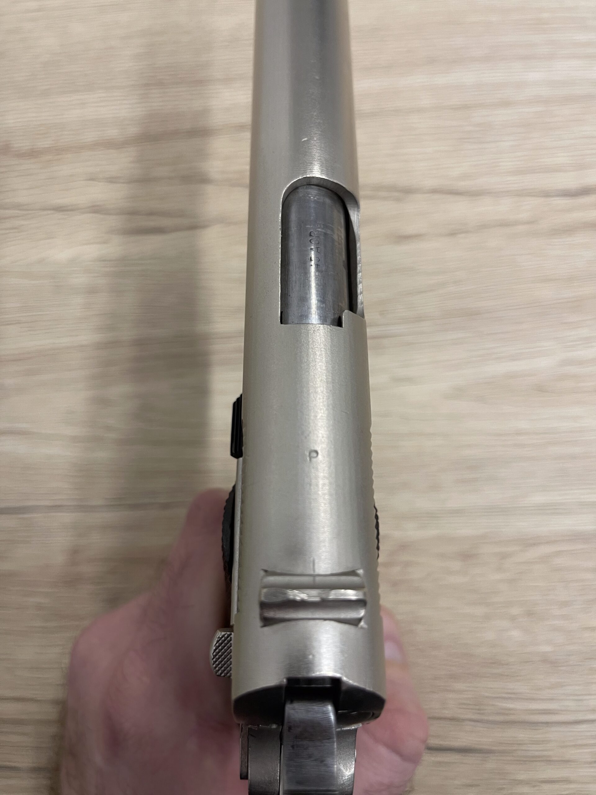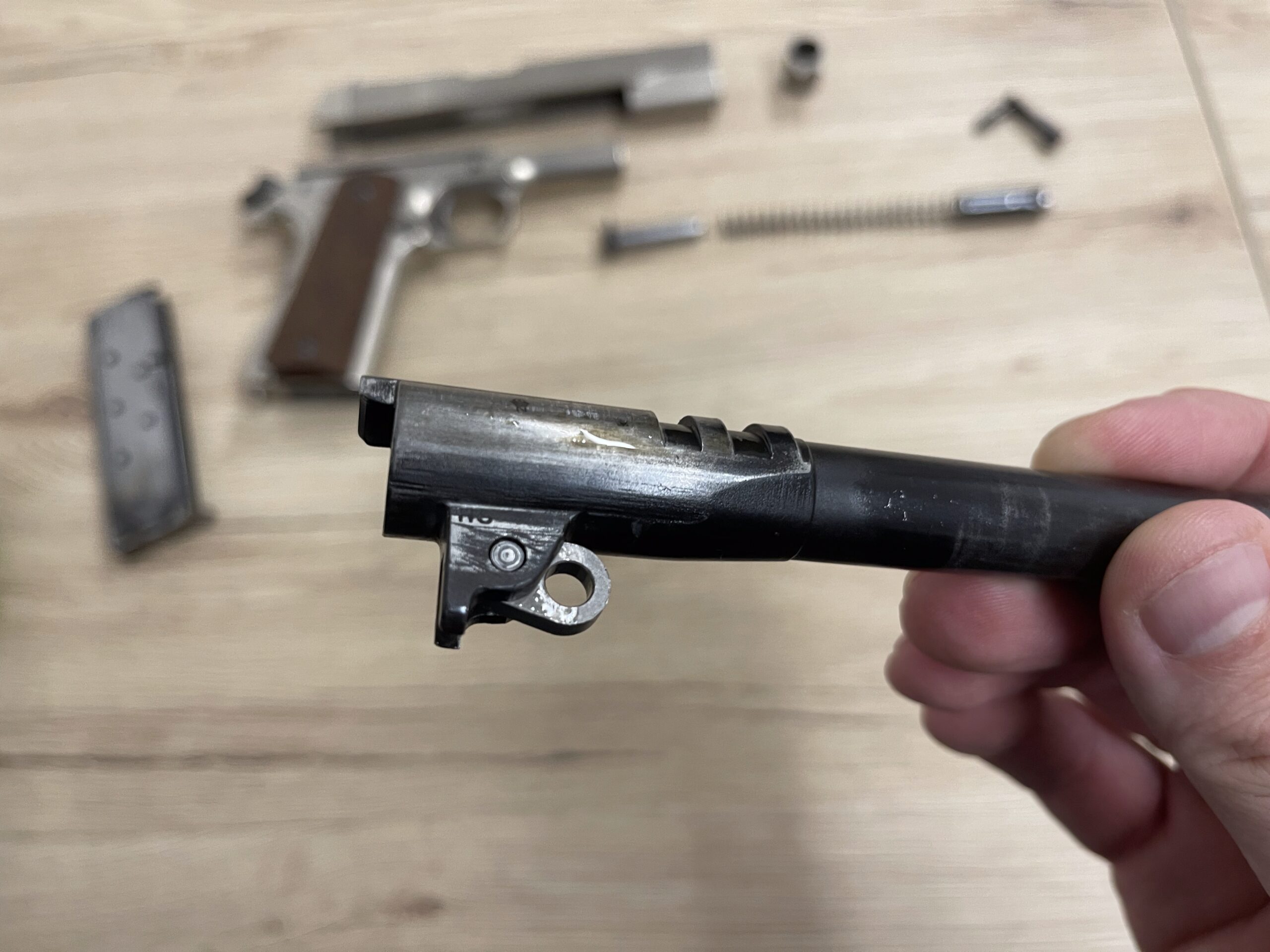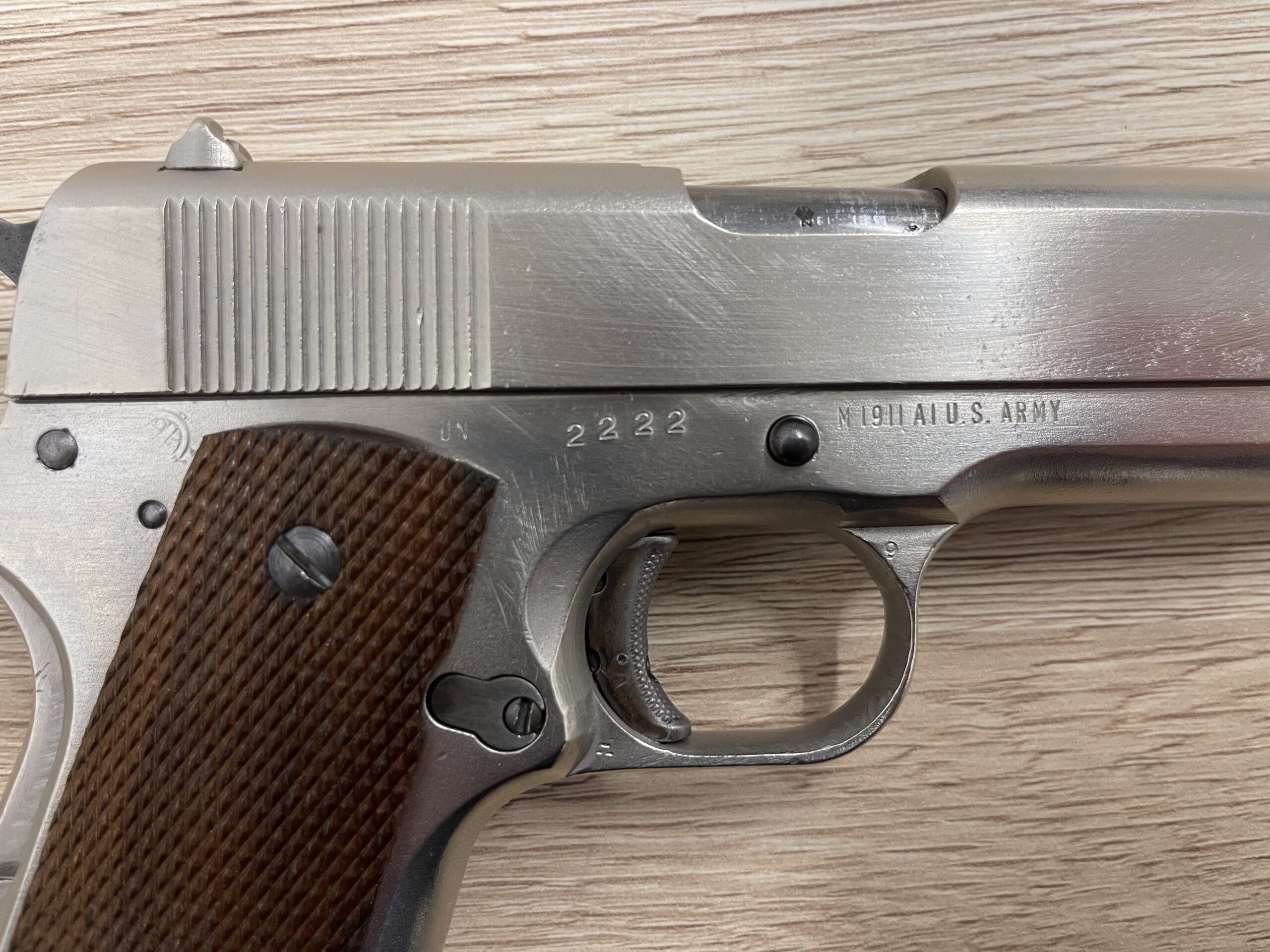Eladó a címben említett fegyver, valamikor és valamelyik tulaj új felület kezelést adott neki. Az unites states property szöveget és az eredeti gyáriszámot is valamikor sajnos kicsiszolták és ez helyére került a jelenlegi gyáriszám, az UN kezdőbetűk még látszanak. Az látszik, hogy a csiszolás más részeket nem érintett, polírozás és homokszórás nyoma sem látható, a gyári kimunkálás megmaradt máshol. A próbajelek és az ellenőri beütők viszont szépen megmaradtak, ahogy az a képeken is látható. Szép a huzagolása HS beütő a megfelelő helyen, szerkezetileg egyben van.